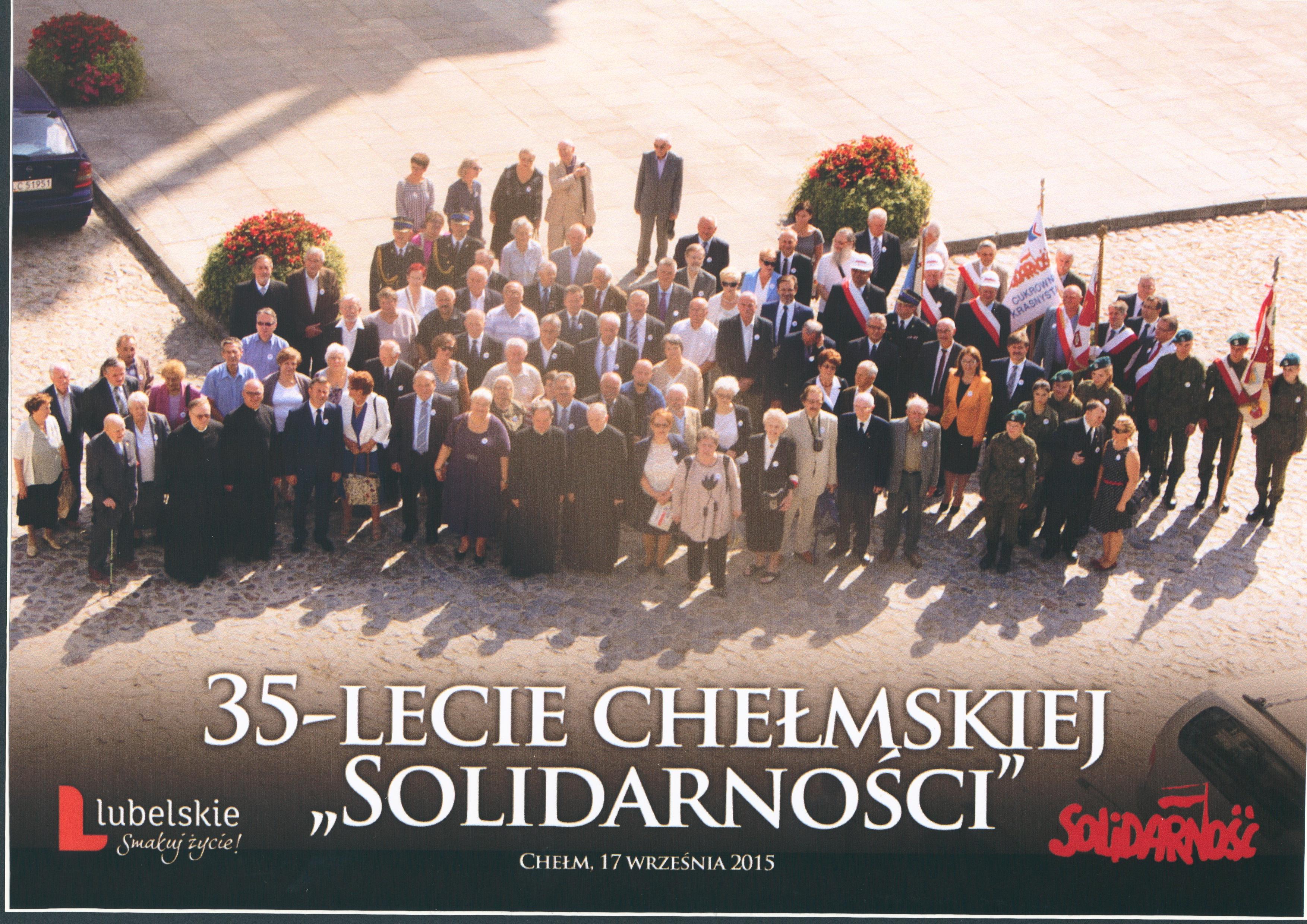 Pamiątkowa fotografia uczestników obchodów 35. rocznicy powstania "Solidarności" w Chełmie.